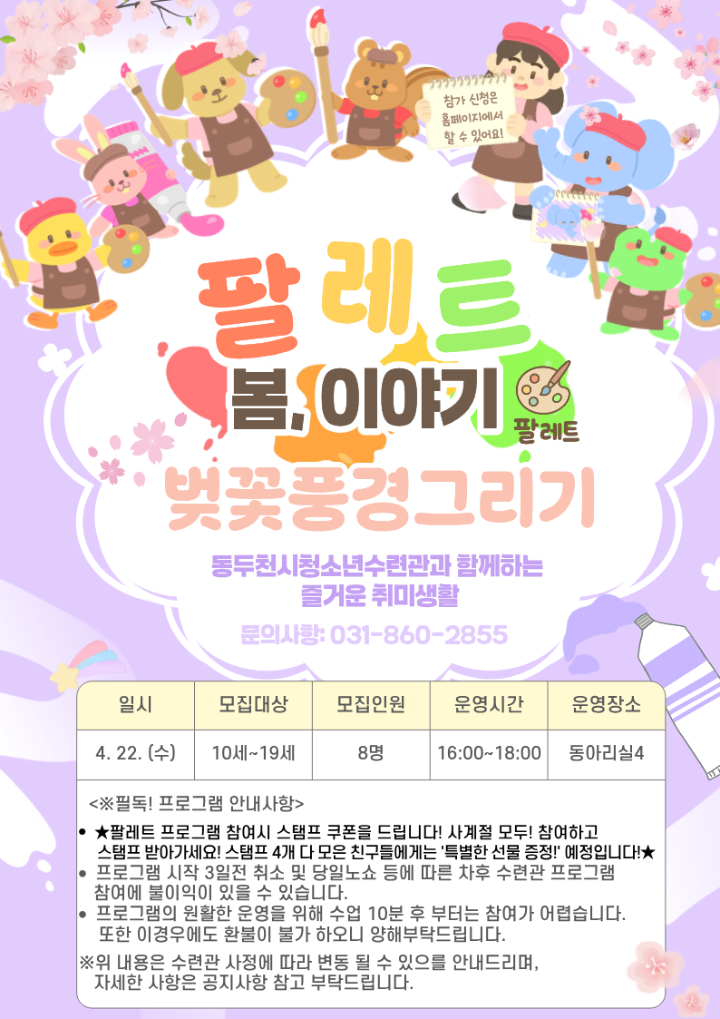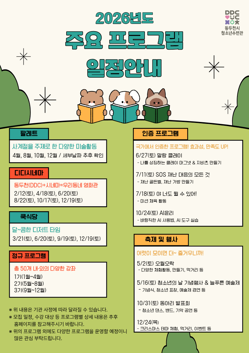 게시물 검색 검색항목선택 제목 내용 검색어 입력 총 게시물 660 개, 페이지 1 / 66 청소년_공지사항 게시물이며, 번호,제목,파일,조회수,작성일,등의 정보를 제공합니다. 번호 제목 파일 조회수 작성일 공지 [공지]2026년 제28회 늘푸른 청소년예술제 개최 알림 및 참여자 모집 안내 33 2026.04.03 공지 [공지] 2026년 4월 청소년수련관 운영일정 안내 103 2026.03.28 공지 2026년도 주요 프로그램 일정 안내 143 2026.03.26 공지 [모집] 특별프로그램 '팔레트: 봄, 이야기' 모집 합니다! 115 2026.03.25 공지 [모집] 2026년 청소년수련관 DDC(씨)네마 4월 영화 관람 참여자 모집 61 2026.03.25 공지 [모집] 2026-2기 정규 프로그램 수강생 모집 안내 261 2026.03.20 공지 [공지] 유료 대관신청 안내 528 2026.01.06 공지 [청소년수련관 대관시스템 변경 안내] 557 2026.01.04 공지 프로그램 감면신청 및 환불 신청안내 6309 2019.12.03 660 [공지]2026년 제28회 늘푸른 청소년예술제 개최 알림 및 참여자 모집 안내 33 2026.04.03 659 [공지]2026년 제1기 정규 프로그램 작품 전시회를 개최합니다. 49 2026.03.28 658 [공지] 2026년 4월 청소년수련관 운영일정 안내 103 2026.03.28 657 2026년도 주요 프로그램 일정 안내 143 2026.03.26 656 [모집] 특별프로그램 '팔레트: 봄, 이야기' 모집 합니다! 115 2026.03.25 655 [모집] 2026년 청소년수련관 DDC(씨)네마 4월 영화 관람 참여자 모집 61 2026.03.25 654 [모집] 2026-2기 정규 프로그램 수강생 모집 안내 261 2026.03.20 653 [홍보] 2026년 진로체험박람회 '청소년이 만나고 싶은 직업인 수요조사' 130 2026.03.11 652 [공지] 수련관 1층 놀이공간(노래방) 토요일 이용제한 안내 107 2026.03.06 651 [모집]청소년수련관 쿡식당 디저트편, 3월 요리특강 '두바이쫀득쿠키' 참여자 모집 167 2026.03.05 1 2 3 4 5 6 7 8 9 10